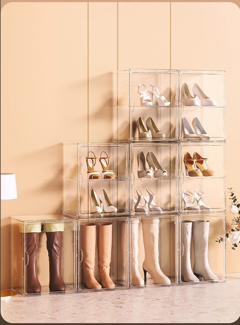 - STACKABLE - The heavy duty acrylic shoe & Handbag boxes are stackable and will not bend or break. Constructed of extra thick acrylic that is hand assembled and polished.