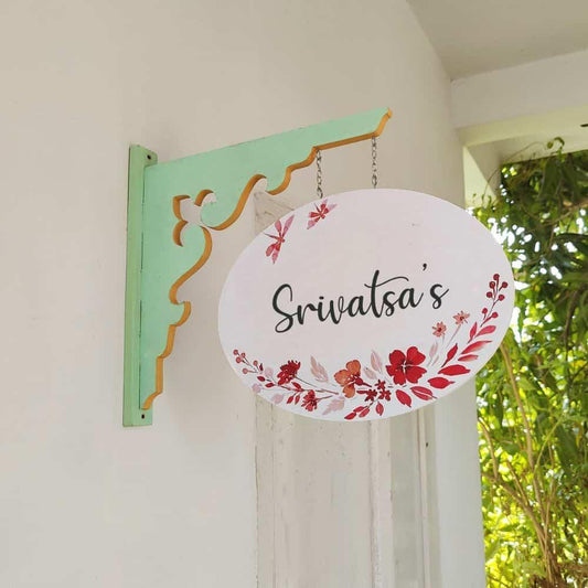 Hand-painted Hanging Name Plate - Mint Green Oval White Red Flowers