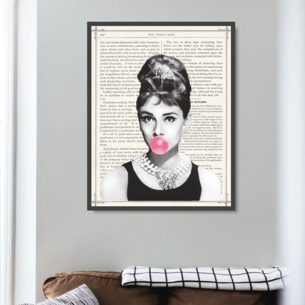 This poster features a playful and iconic image of Audrey Hepburn blowing bubblegum with a snippet of The New York Times newspaper in the background. The poster captures the beauty and elegance of Audrey Hepburn in a unique and creative way. The use of The New York Times newspaper in the background adds a touch of nostalgia and highlights the influence and impact Audrey Hepburn had on the entertainment industry. This poster is perfect for adding a touch of vintage Hollywood glamour to any room. It will be perfect for those who appreciate the beauty of Audrey Hepburn, vintage and nostalgia.