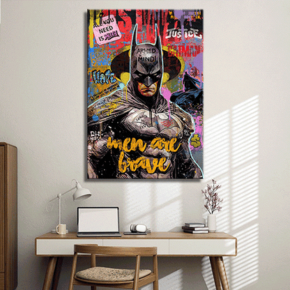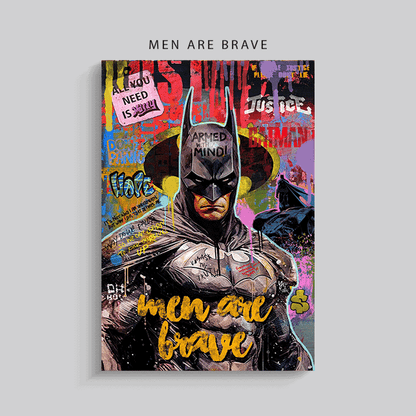 Channel the strength and determination of a hero with Men Are Brave. This bold and vibrant canvas artwork features a powerful depiction of Batman, layered with dynamic graffiti elements and inspiring words. The mix of colors and textures creates an energetic, street-art vibe that adds a strong statement to any room. Perfect for those who admire courage and resilience, this piece is sure to stand out and inspire.
