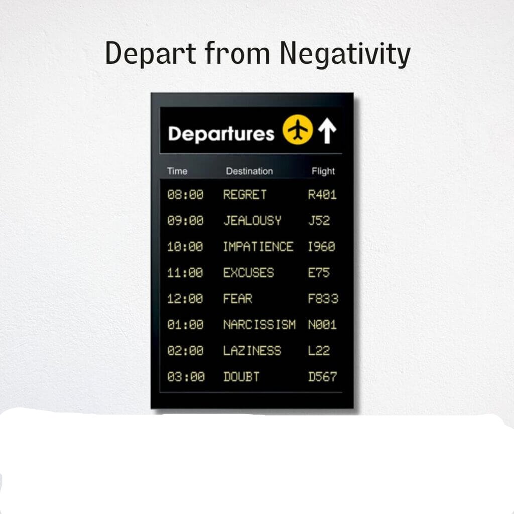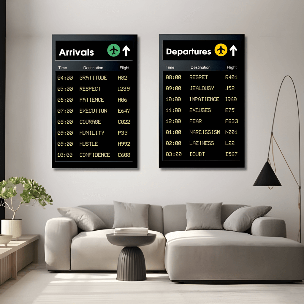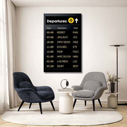 Complementing the "Arrive in Positivity" is "Depart from Negativity", the departure board for all things gloomy. With scheduled takeoffs for 'REGRET' and 'DOUBT', it's a playful nudge to let go of the heavy baggage and embrace a lighter way of life. Place it where you wind down, and let it be the sign-off to a day well spent. Whether you're gifting them or getting them for your gallery of good vibes, these artworks will surely add an exclusive and uplifting touch. Get ready to board a mindset that's all about elevation, and leave behind the turbulence of negativity.