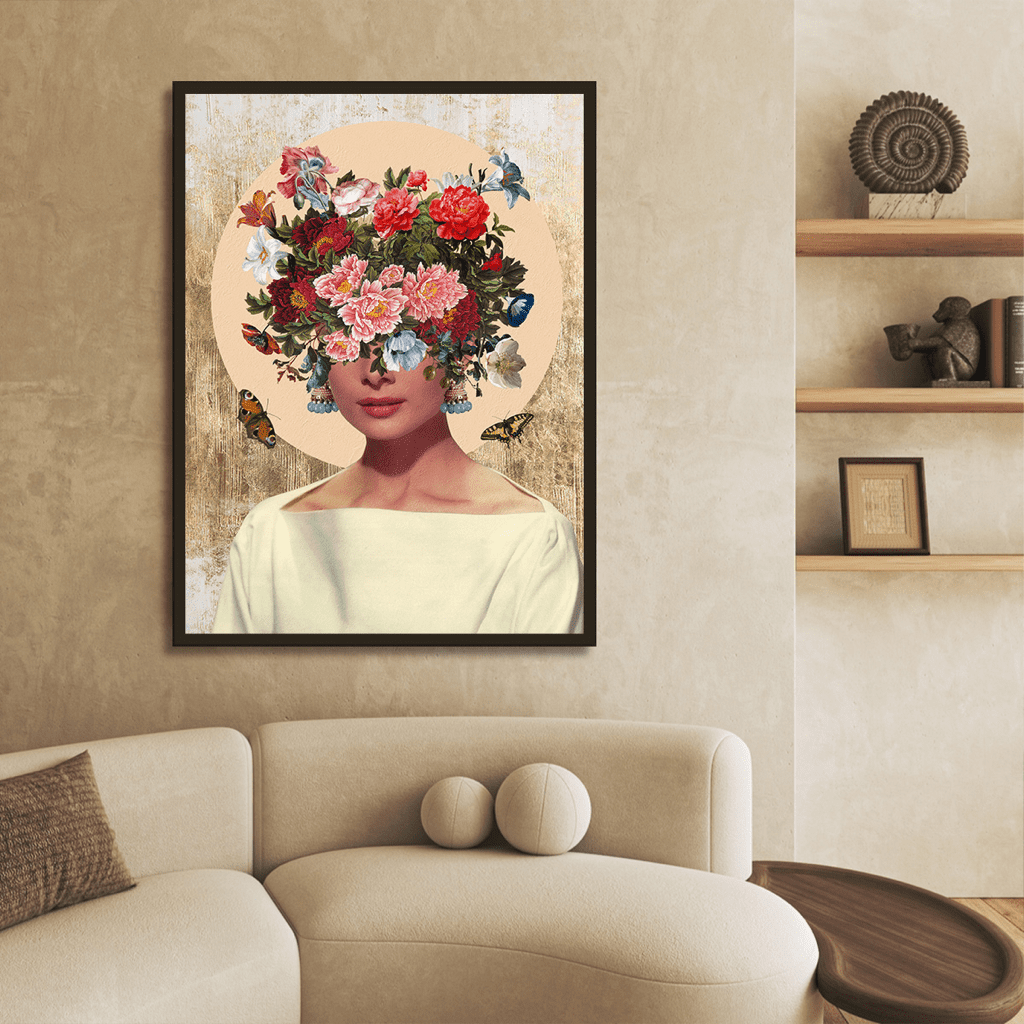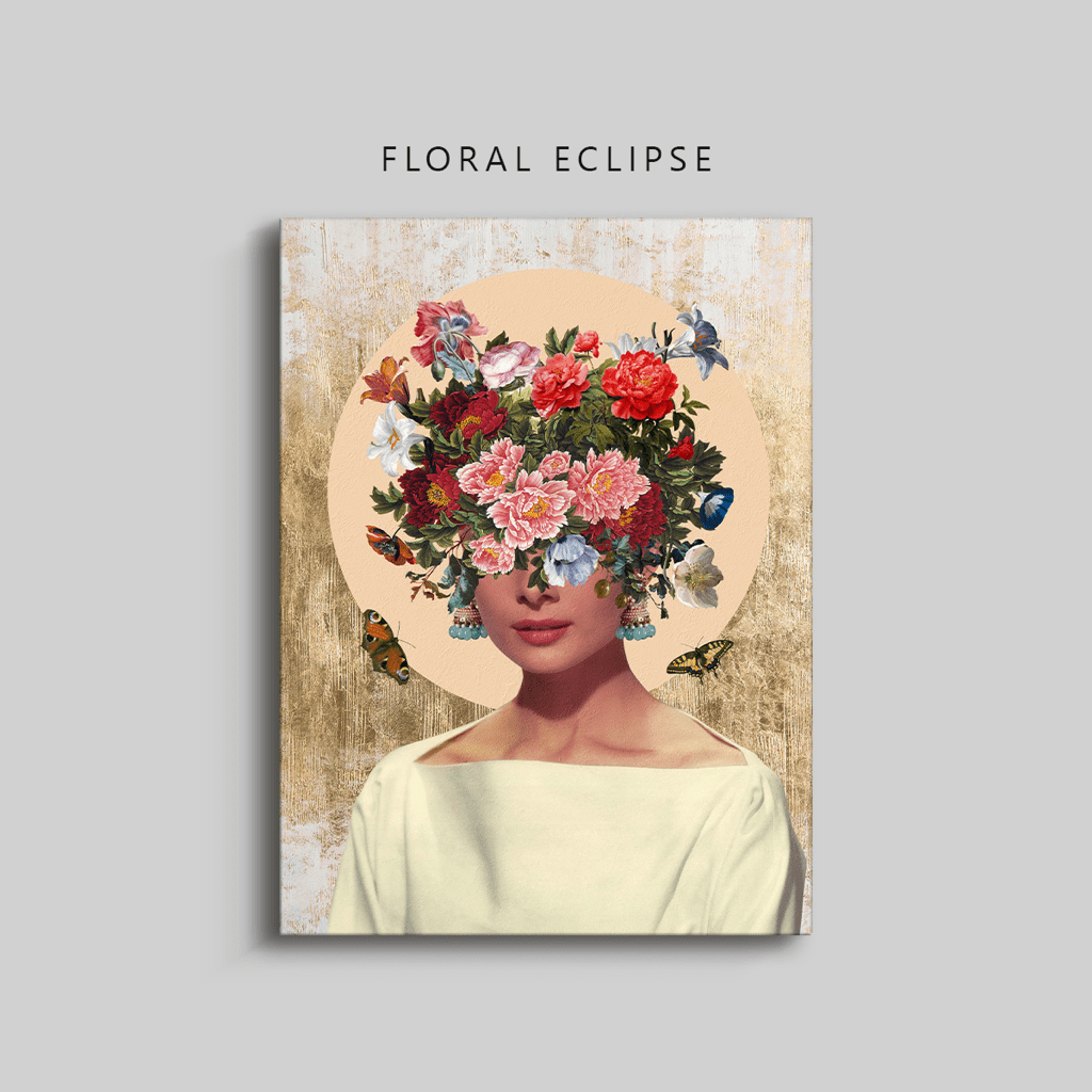 Discover the beauty of "Floral Eclipse," a stunning piece of canvas wall art that brings nature's charm into your home. This artwork showcases a woman's face, hidden beneath a vibrant blend of flowers and leaves. Delicate butterflies flutter around her, adding a touch of whimsy. The background sparkles with hints of gold, making it a truly unique piece. Perfect for anyone who loves art that tells a story.