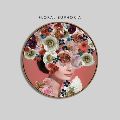 Discover the beauty of nature and art combined in our "Floral Euphoria" canvas wall art. This unique piece showcases a woman's face, hidden beneath a vibrant blend of flowers and leaves, creating a mesmerizing and serene scene. Perfect for adding a touch of nature's tranquility and art's magic to your space, this round canvas is a must-have for anyone looking to bring life and color into their home.