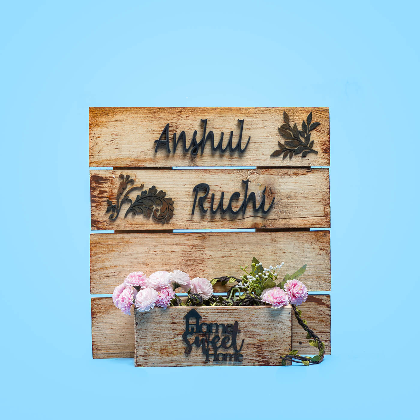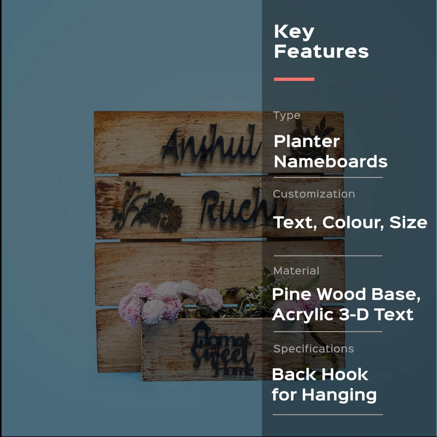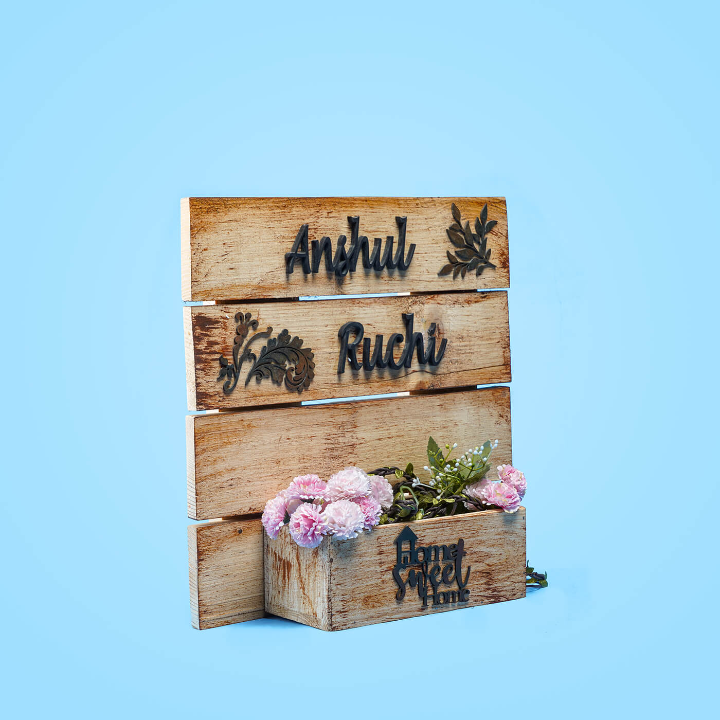 - Handcrafted in pinewood, the nameboard has a spacious plant holder attached to it.